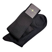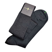 Glatt gestrickter Kniestrumpf in feinster Merinowolle mit einer Beimischung aus Nylon zur Verstärkung von Ferse und Spitze.