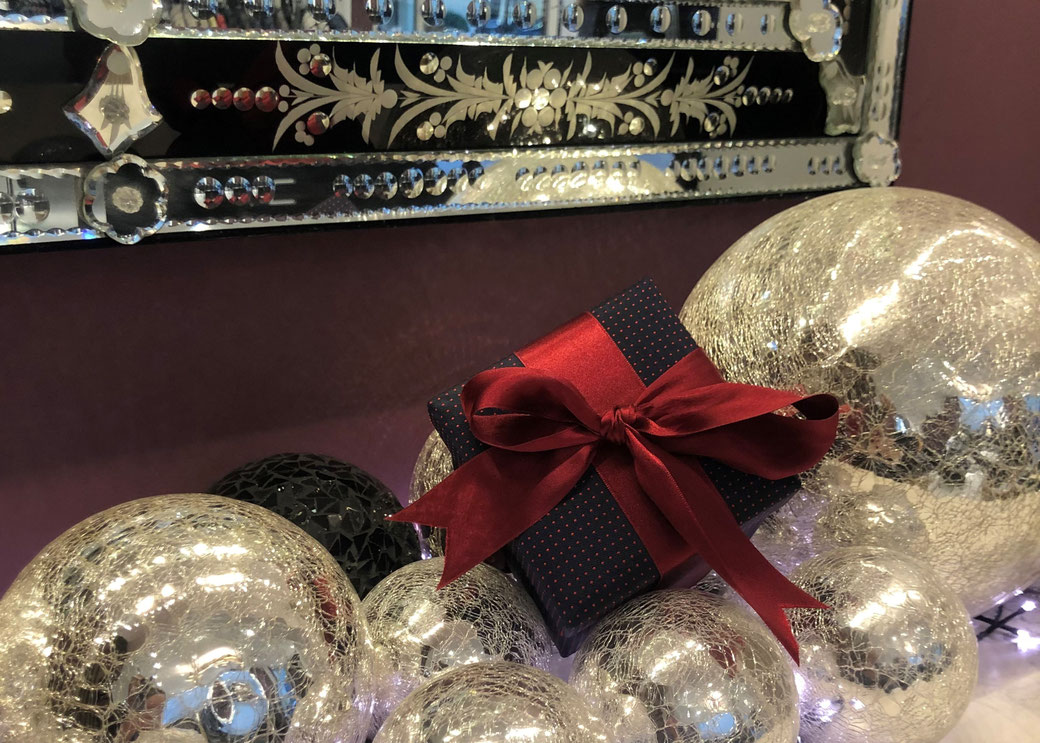 Stilvolle Geschenke, verpackt in unserem ikonischen gelb gestreiften Papier und verziert mit einer silbernen Schleife.